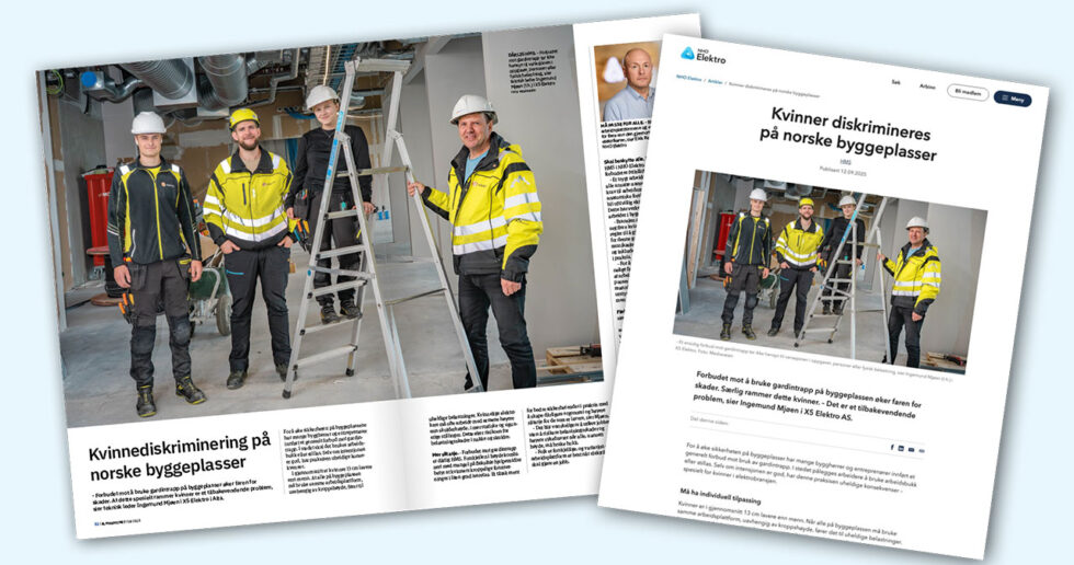 - Når krav til arbeidsmetoder ikke tar høyde for anatomiske forskjeller, kan konsekvensen bli økt risiko for belastningsskader og økt sykefravær. Elektrobransjen må sikre at arbeidsplattformene og -metodene passer for flere enn den gjennomsnittlige mannlige elektrikeren. Forbud mot å bruke gardintrapp er dårlig MHS-arbeid, sier Eirik Remo, HMS-fagsjef i NHO Elektro, i faksimilen av artikkelen som blant annet er publisert i Elmagasinet, nhoelektro.no og bygg.no