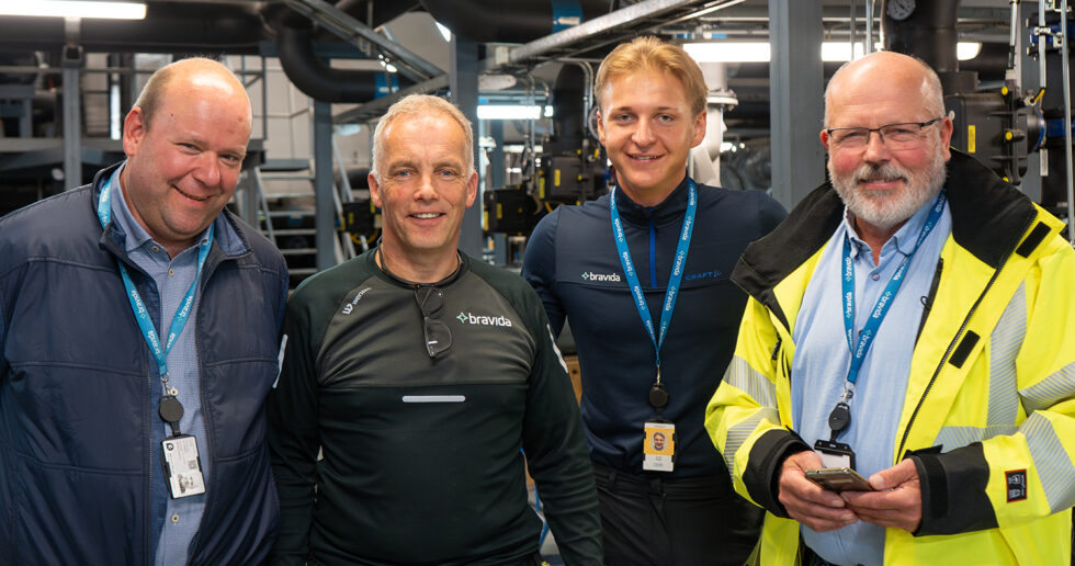 Tom Sæthershagen, fagansvarlig elektro og ekom, elektromontør Erik Wang, serviceleder Fredrik Kåsbøll og Trond Bekken, fagansvarlig HMS, i Bravida Norge på vernerunde Foto: Bravida