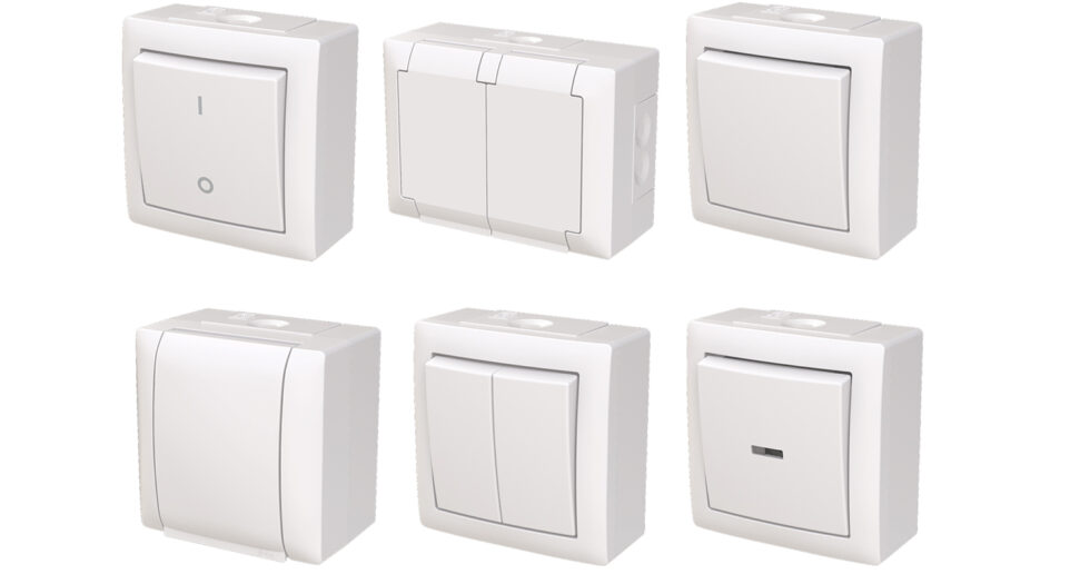 De passer ved garasjen, inngangspartiet, på terrassen og langs fasader. Stikkontaktene er enkle og doble. Bryterne leveres som 1-pol og 2-pol, med dobbel vippe og i impulsutførelse.