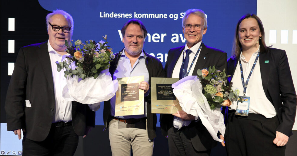 Gratulerer til Lindesnes kommune og Skanska som vinnere av Energismartprisen 2026. Fra venstre Bård Folke Fredriksen (administrerende direktør i NBBL), Erik Sandnes (prosjektleder i Skanska), Kyrre Jordbakke (rådmann i Lindesnes kommune) og Marie Loe Halvorsen (næringspolitisk direktør i Elektroforeningen). Foto: Linn Martinsen Kise, Elektroforeningen